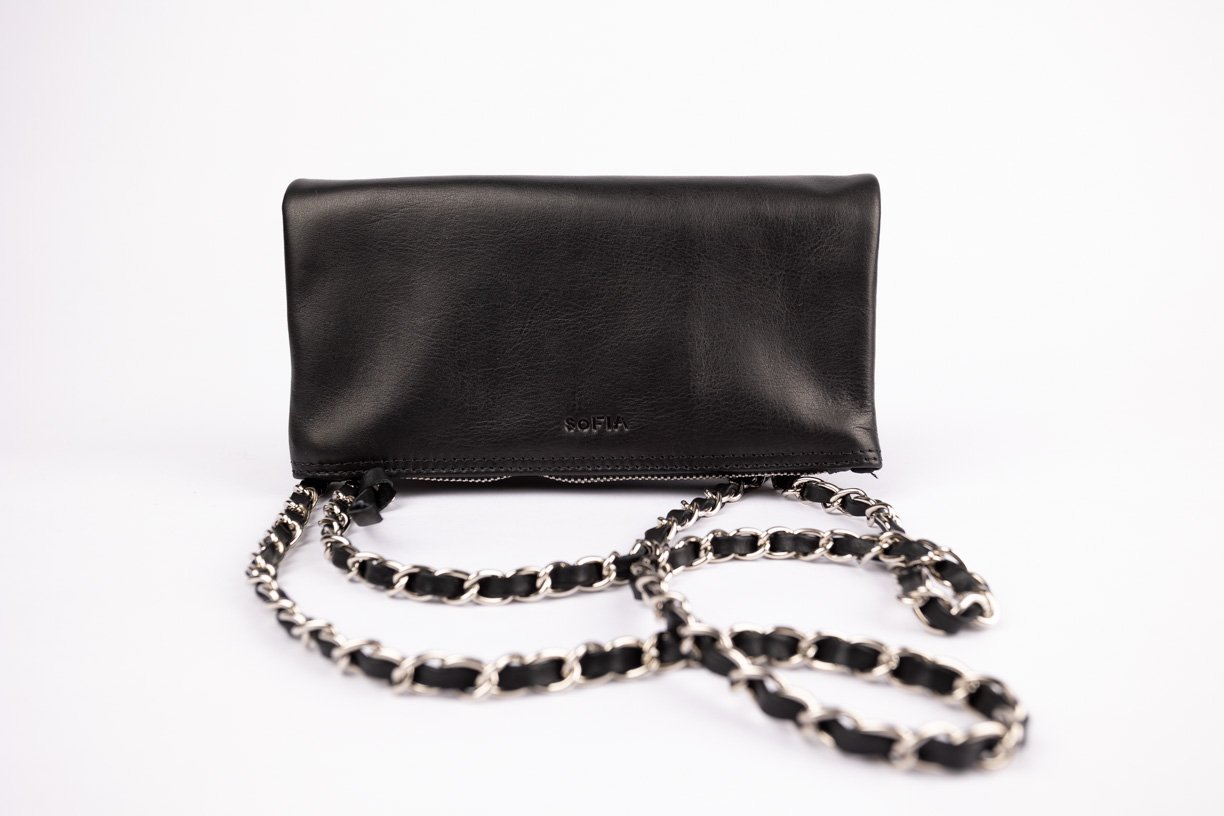 Diseño en 100% cuero con cierre metálico exterior y dos cadenas trenzadas con cuero, una larga y otra corta, ambas desmontables. Cuenta con 2 bolsillos externos. Versátil y compacta, perfecta para llevar lo esencial con estilo.
