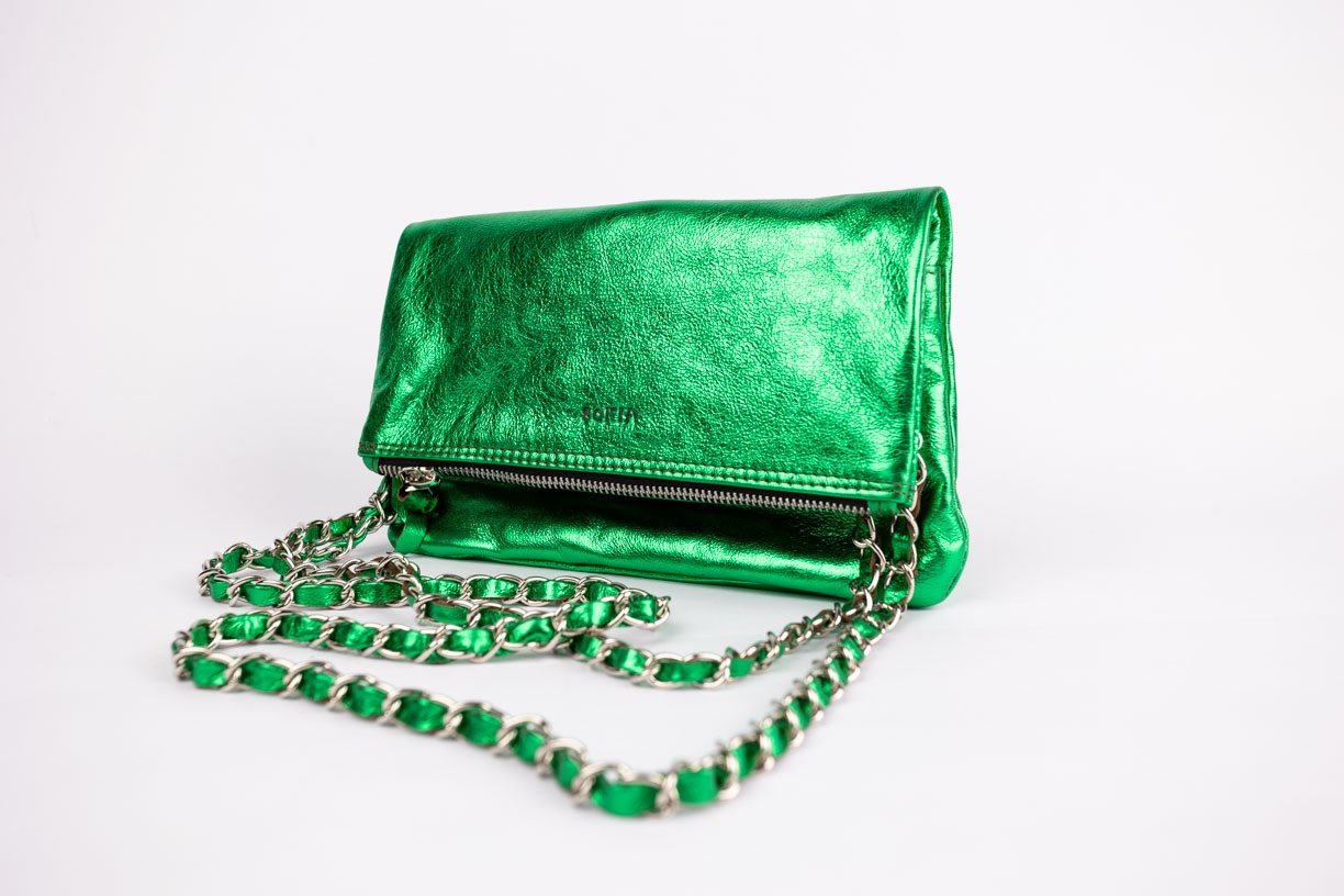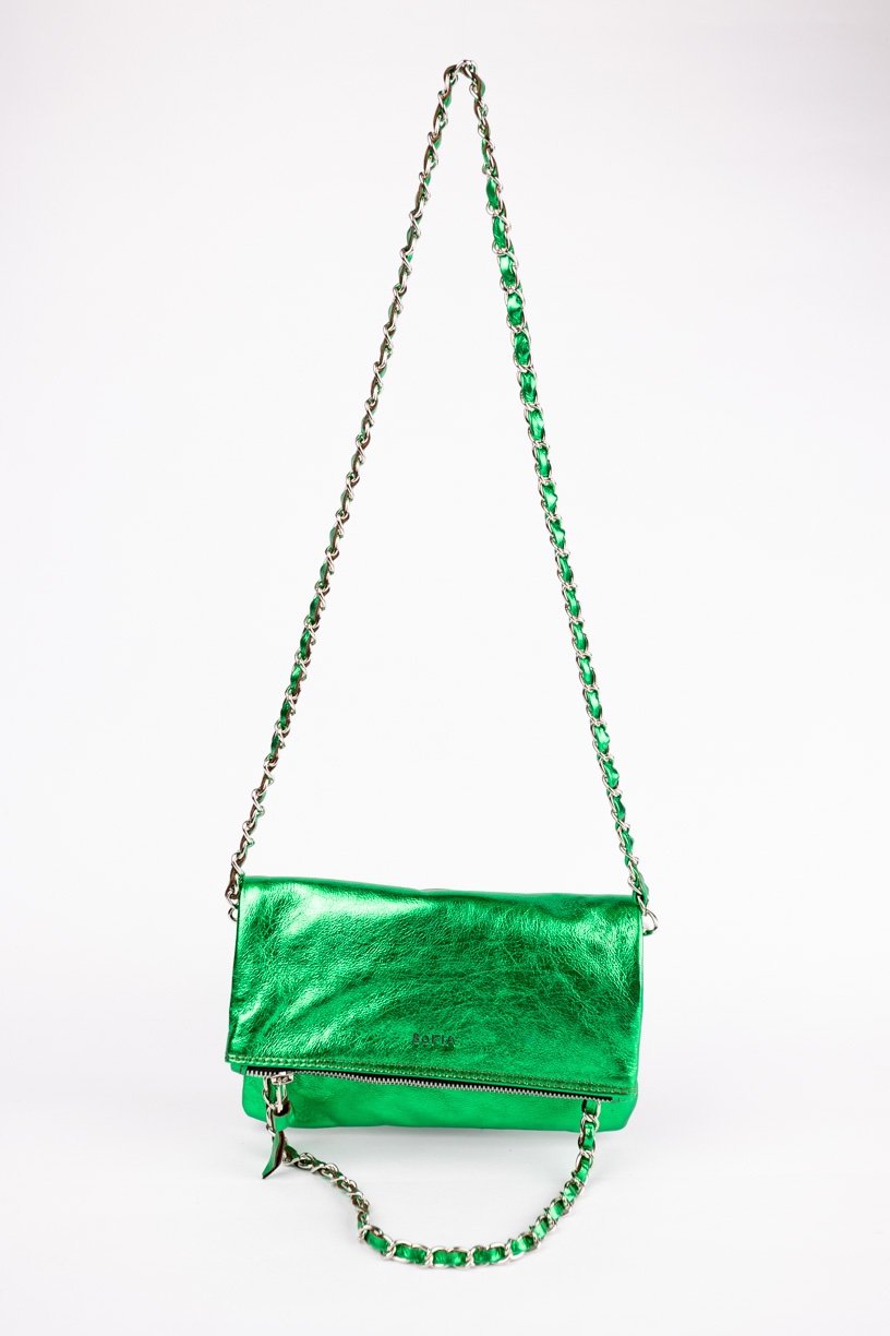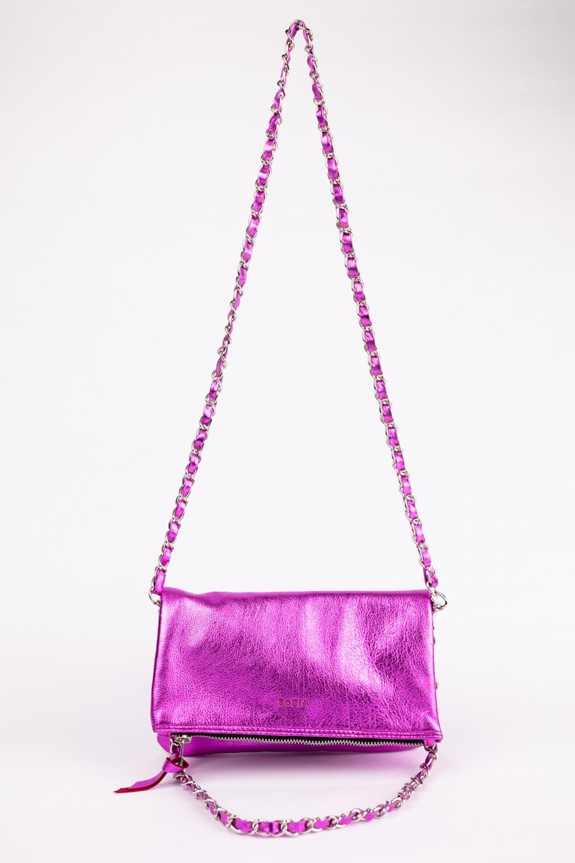 Diseño en 100% cuero con cierre metálico exterior y dos cadenas trenzadas con cuero, una larga y otra corta, ambas desmontables. Cuenta con 2 bolsillos externos. Versátil y compacta, perfecta para llevar lo esencial con estilo.