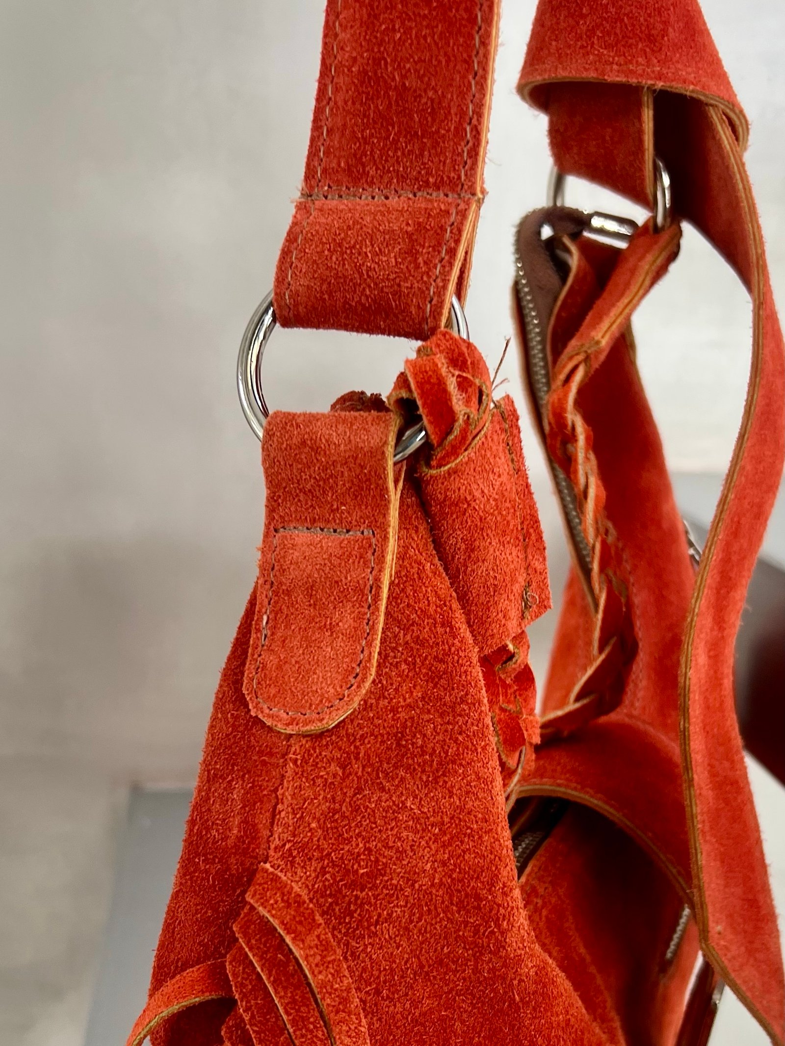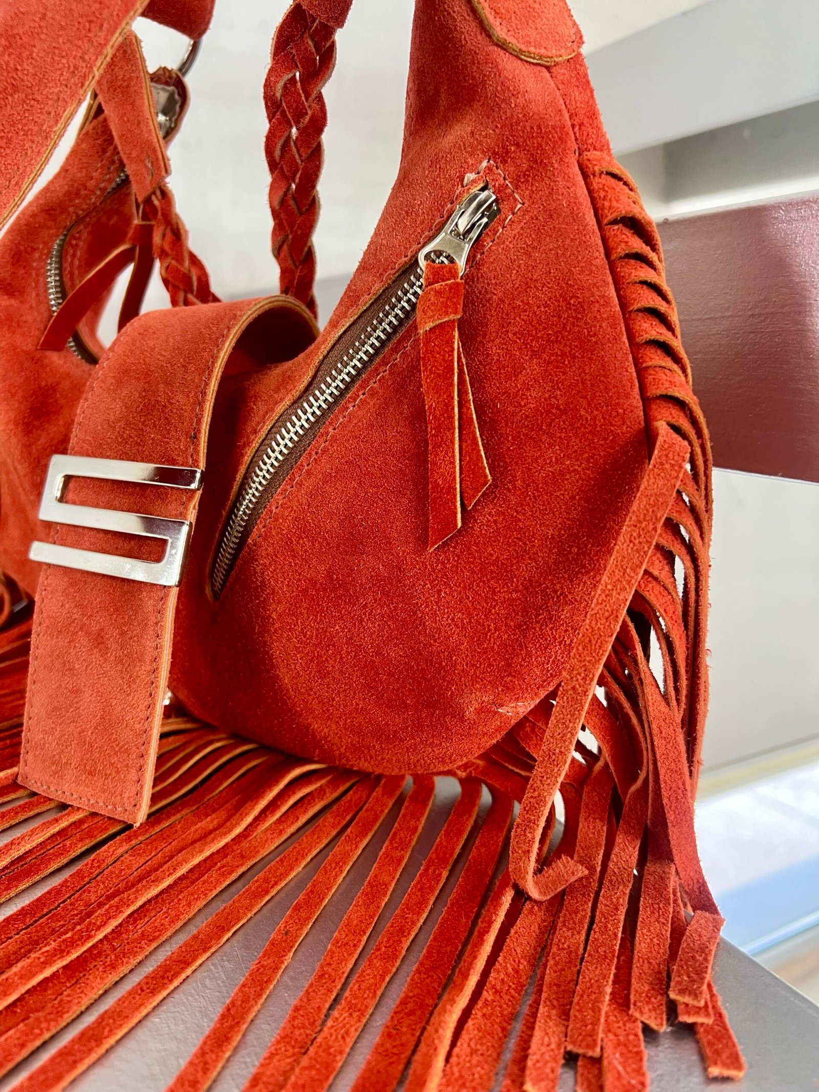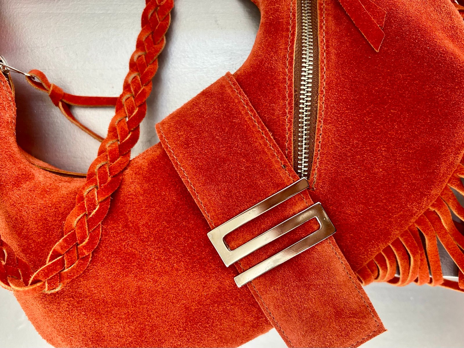 Cartera en 100% cuero gamuza con textura suave y un diseño de impacto. Cuenta con aro abierto, cierre metálico y herraje exclusivo en forma de “S”. Cuenta con un asa corta trenzada, mientras que la correa larga regulable y desmontable permite llevarla como más te guste.