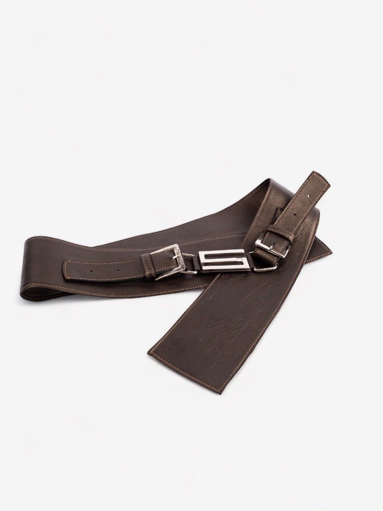Diseño estructurado y elegante, confeccionado en 100% cuero genuino. Su ajuste a la cadera y su doble hebilla aportan carácter y estilo, mientras que la pieza central en forma de “S” en metal plateado añade un toque distintivo.